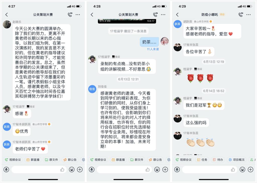 期末考核以《公关策划大赛》的形式进行,利用钉钉群会议模式,10个团队分别进行PPT方案展示。任课教师邀请业内专家、优秀毕业生代表共同担任评审,充分发挥线上会议的便利性,汇聚多方资源,完成教学任务。