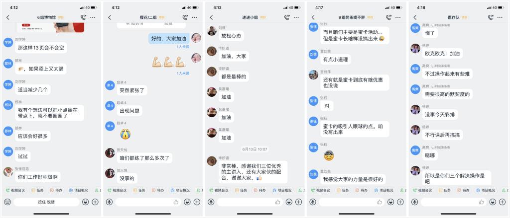 学生利用钉钉项目群模式开展小组讨论,教师可同时“在线围观”多个小组的发言情况。针对同学们的想法,随时给与鼓励或指正;学生遇到问题在群里@老师也会及时得到回复。讨论环节必须在规定时间内完成,利用限时规则激发学生主动性。这种分组自由讨论、多组平行开展的方式,大大提升了公关策划的效率,也方便老师督促学生更加投入课堂。