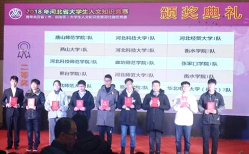 2018年12月7日至10日,由河北省教育厅主办、河北师范大学承办的2018年河北省大学生人文知识竞赛在石家庄隆重举行,来自全省41所高校的78支队伍参加了比赛。由我系吴宇卓、王博伦、冀金金、田明等同学和资管系、生科系、化学系、史法系学生组成的两支代表队分获二等奖、优秀奖,pp电子官网荣获优秀组织奖,我系田甜、韩书庚两位老师荣获优秀指导教师奖。