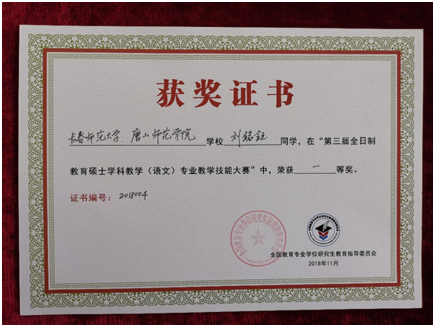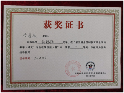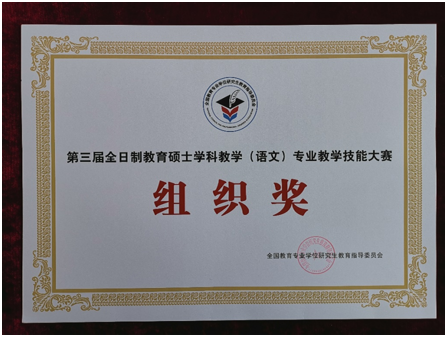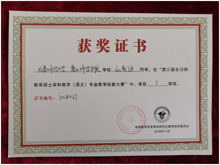 2018年11月17日至19日,由全国教育专业学位研究生教育指导委员会主办的第三届全日制教育硕士学科教学(语文)专业教学技能大赛在江西师范大学举行。来自全国的88所院校的315名学科教学(语文)研究生参加复赛,经专家评审选出120名选手参加决赛。pp电子官网与长春师范大学联合培养的两名研究生均进入决赛。其中刘铭钰荣获决赛一等奖,刘彦廷荣获决赛三等奖,学科教学(语文)导师团队李海凤老师被评为优秀指导教师。pp电子官网被全国教育专业学位研究生教育指导委员会授予第三届全日制教育硕士学科教学(语文)专业教学技能大赛组织奖。