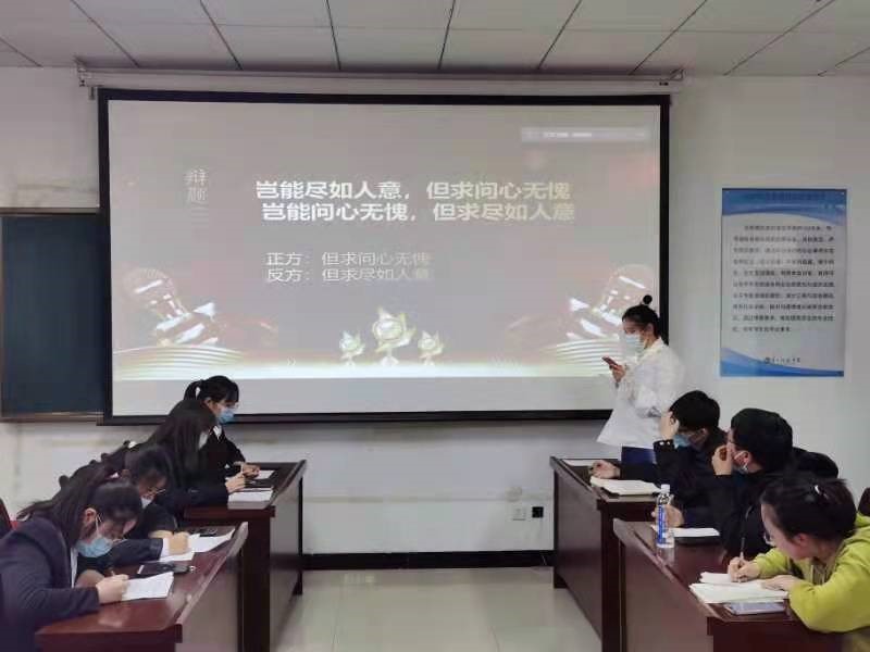 由于疫情原因,辩论赛采取线上线下相结合的方式。其中,“宽松式管理对大学生来说是利大于弊还是弊大于利”这个辩题引起了同学们的兴趣。最终同学们更加认同,在当前疫情防控的严峻形势下,学校封闭管理模式为抗击疫情提供了强有力的保障。在“个人利益与集体利益的取舍关系”这一个论点中,同学们进行了深入思考,不管是个人还是集体,都要为自己的行为负责。对于我们该如何处理个人和集体的关系得出了积极的结论。辩手们逻辑清晰,慷慨陈词,赢得了阵阵掌声。最后,特邀评委金口才社长对此次辩论赛进行点评。