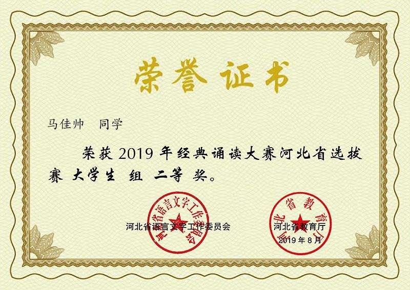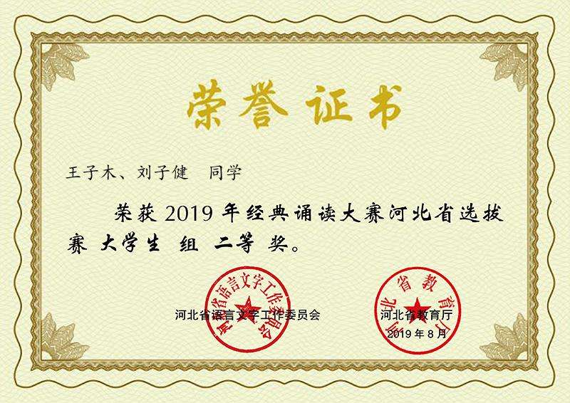 2019年6月,由河北省语委、省教育厅主办,河北大学协办的“2019年河北省经典诵读大赛”落下帷幕,我系心音朗诵社选派的两部参赛作品《雨巷》和《将进酒》,均斩获大赛二等奖。pp电子官网两组选手将与其他高校9组选手一同,代表河北省参加全国复赛。