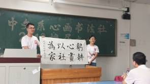 在中文系心画书法社即将迎来成立十年之际,2018年9月11日下午,心画书法社2016级、2017级成员在北院文201教室举行了简短而隆重的换届会议。会议首先播放了年度工作总结视频,大家一起回忆一年以来心画书法社走过的时光。接下来,两任社长先后发言,总结成绩,展望未来。随后,新任社长、2017级的马佳帅向上一任社长、2016级刘佳琪赠送了“躬耕心画,以社为家”的书法作品,并举行了社旗交接仪式。