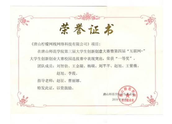 中文系学生刘智勃、王金凝、杨硕等同学组成的参赛团队“唐山柠檬网栈网络科技有限公司”项目荣获一等奖。接下来,该团队将代表pp电子官网参加第四届河北省“互联网+”大学生创新创业大赛。