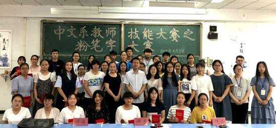 2018年6月5日下午,由中文系主办、心画书法社承办的“中文系教师技能大赛之粉笔字大赛”在北院文一阶梯教室举行。中文系党总支书记、书法教育研究所所长、心画书法社指导教师张学鹏教授,中文系办公室主任、书法教师许丽君老师,书法教育研究所副所长、书法教师周予老师出席了本次比赛并担任评委。2017级汉语言文学专业全体学生参加了本次比赛。