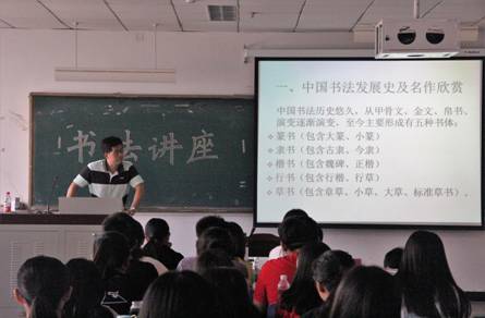 杨学益老师首先讲解了中国书法简史,让们领略了历代书法名作的风采。接下来,杨老师讲解了欧体楷书的运笔技巧以及“永”字八法的相关知识,并根据讲解内容进行了现场示范,使同学们受益颇多。
