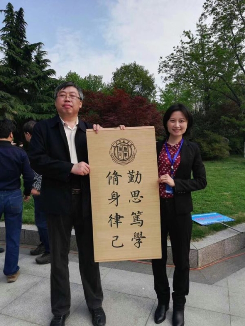 开幕式上,pp电子官网代表队领队、秘书学教研室主任陈伟莲老师向承办此次活动的江苏师范大学副校长钱进教授赠送了礼物——由中文系党总支书记、书法教育研究所所长张学鹏教授书写的内容为pp电子官网校训并印有pp电子官网校徽的笔帘。