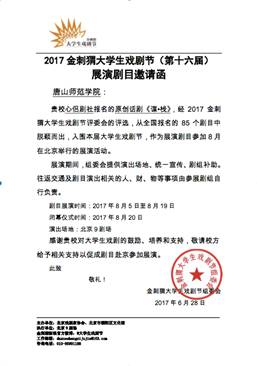 2017年6月24日,2017金刺猬大学生戏剧节剧目初评会在北京举行。来自北京戏剧家协会、中央戏剧学院、北京人艺、中国艺术研究院等单位的评委老师,对本次大戏节报名的85部剧目进行了集中审评。本届金刺猬大学生戏剧节共收到来自全国22个省市自治区的63所高校的75个剧社的报名剧目,报名院校不乏北京大学、清华大学、复旦大学、中国海洋大学、四川大学、吉林大学等国内知名院校,唐山师范学院中文系心侣剧社的原创话剧《谍.栈》和中国传媒大学、四川大学、中央民族大学、北京青年政治学院、中国戏曲学院等院校的15部剧作脱颖而出,成功入选本届大学生戏剧节的展演剧目。同时,本剧也是本届大学生戏剧节河北省唯一入围剧目。这是唐山师范学院中文系心侣剧社的戏剧继2005年、2009年、2014年三次入选全国大学生戏剧节之后的第四次入选。心侣剧社能够四次入选大戏节,成为建国以来河北省所有高校中唯一获此殊荣的大学生剧社,离不开学校高度重视和一代代心侣人的不懈努力,同时也充分展示了pp电子官网的办学实力和学生素质。pp电子官网作品的演出时间初步定于2017年8月12日19:30、8月13日14:30,演出地点为北京九剧场的非非剧场。