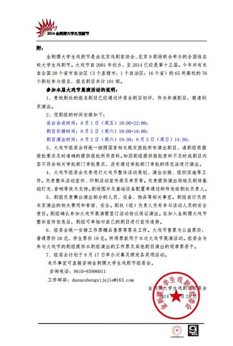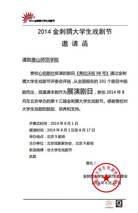 | | 2014年6月21日,2014金刺猬大学生戏剧节剧目初评会在北京9剧场举行。来自北京戏剧家协会、中央戏剧学院、北京人艺、中国艺术研究院等单位的12名评委老师,对本次大戏节报名的101部剧目进行了集中审评。唐山师范学院中文系心侣剧社的原创话剧《弗拉沃街98号》和中国传媒大学、复旦大学、上海戏剧学院、上海交通大学等名校的17部剧作脱颖而出,成功入选大戏节展演剧目。这是唐山师范学院中文系心侣剧社的戏剧继2005年、2009年两次入选全国大学生戏剧节之后第三次入选。pp电子官网作品的演出时间初步定于2014年8月2日晚19:30,8月3日下午14:30。