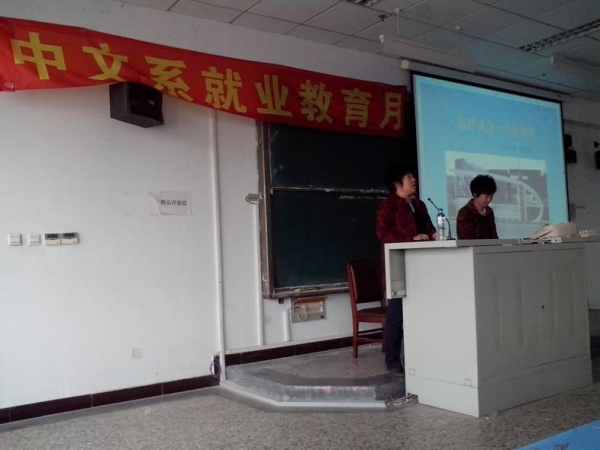 2013年10月22日下午,中文系就业教育月活动第二场讲座在北院文2阶梯教室举行。本次讲座主讲人是“唐山市十佳教师”、唐山市雷锋小学郑艳玲校长。郑校长就“怎样做好一名教师”这一主题为教师教育专业的同学做了精彩讲述。中文系主任、文学博士张素凤教授,中文系学工办主任曹丽娜老师以及中文系二百多名学生参加了此次活动。