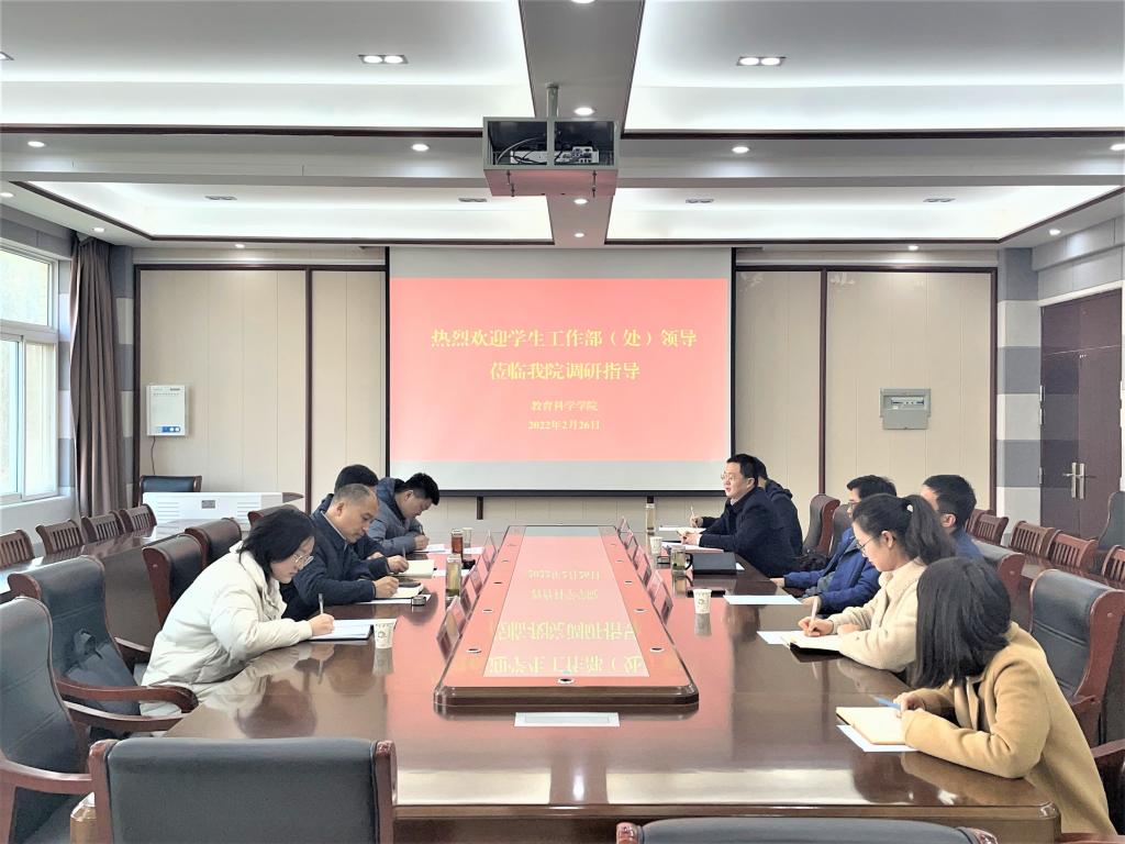 时间:2022-02-26 19:43:09 来源:教科院新闻部 作者:马玉娇 周媛媛 曹童然 亓亚兴 阅读: 次2月26日,信阳师范学院学生工作部(处)长王建旭,副部(处)长雷梁,学生教育科科长孙绪曙到永利集团官网开展调研指导工作。永利集团3044官网欢迎您党委书记房加帅,院长何安明,党委副书记董银银,副院长郭勇、孙天义以及全体专职辅导员参加会议。会议于教科楼402会议室召开,由房加帅主持。